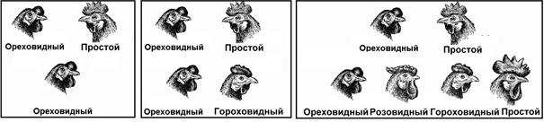Трех петухов с ореховидными гребнями скрестили с курами, имеющими простые гребни. В одном случае все потомство имело ореховидные гребни, в другом — ореховидные и гороховидные, а в третьем — ореховидные, розовидные, гороховидные и простые гребни.