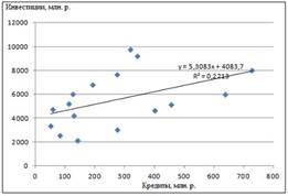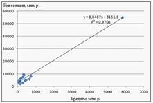 высокое значение коэффициента детерминации говорит о том, что между объемом кредитов и объемом инвестиций в основной капитал существует тесная линейная зависимость