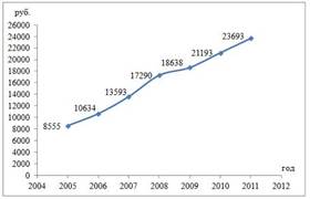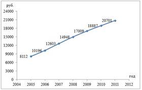 Динамика показателя среднедушевого денежного дохода населения России в период 2005–2011 гг. характеризуется данными, представленными на графике.