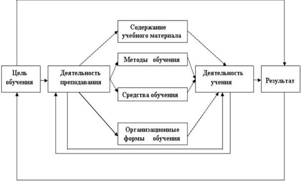 Основными компонентами процесса обучения выступают: цель обучения, деятельность учителя (преподавание), деятельность учащегося (учение), содержание учебного материала, методы, средства и формы обучения, результат обучения.