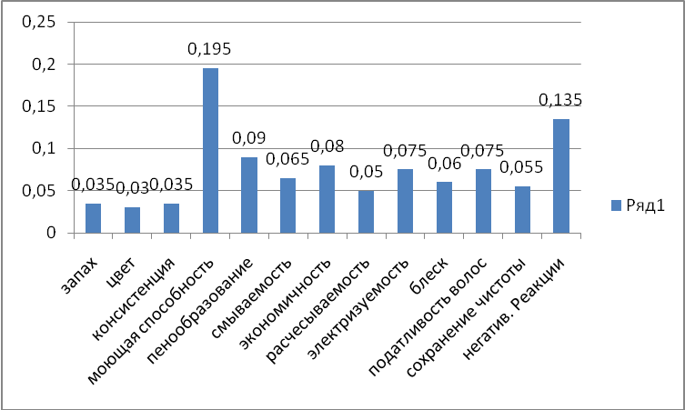 Как видно из диаграммы, наибольшую весомость, по мнению экспертов, имеет показатель «моющая способность». Высокую оценку получила характеристика «появление негативных реакции», непосредственно связанная с безопасностью товара. Кроме этого значимыми являются такие свойства, как пенообразование, смываемость, расчесываемость и блеск волос. Эстетические показатели (запах, цвет, консистенция) получили самые низкие коэффициенты весомости.