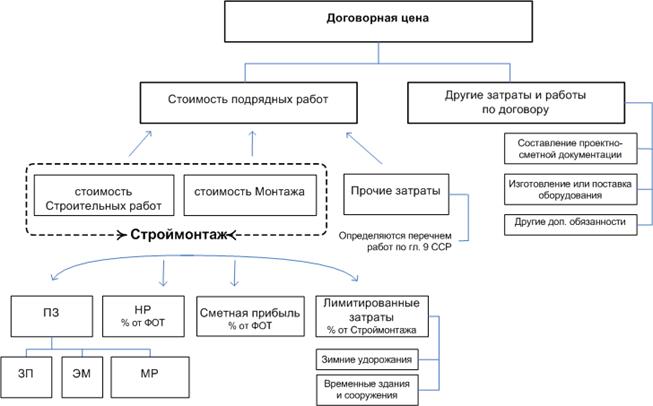 Стоимость строительных и монтажных работ по принятой в сметном ценообразовании группировке затрат содержит прямые затраты, накладные расходы, прибыль подрядчика (СП), лимитированные затраты.