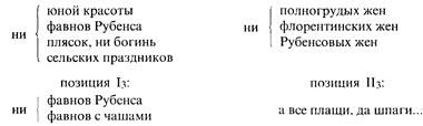 Мы можем сделать вывод, что в поэтическом тексте возникает некоторая вторичная «синонимия»: слова оказываются эквивалентными только лишь в силу своего изометризма. Эпитеты «флорентийских», «Рубенсовых», «полногрудых» оказываются соединенными со словом «жен» как взаимозаменяющие, хотя очевидно, что «Рубенсовы жены» и «полногрудые жены» действительно обозначают одну и ту же картину, а про «флорентийских жен» этого нельзя сказать. В равной мере «фавнов Рубенса» и «фавнов с чашами» имеют, конечно, в виду одну картину – эрмитажного Вакха, «юная нагота», «пляски» и «богини» – другие живописные произведения. Однако разница на уровне денотата здесь ничего не означает: в поэтическом тексте эти слова выступают как синонимы, что заставляет предположить, что речь идет о каком-то другом денотате, инвариантном для всех этих эквивалентных сегментов текста (например, «любое произведение небатальной живописи»). Так ритмическая структура текста создает некоторую вторичную синонимию, а эта синонимия конструирует особый мир денотатов. Поэзия не описывает иными средствами тот же мир, что и проза, а создает свой мир.