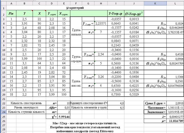9. Порівняємо c2табл з критерієм μ, робимо висновок, використовуючи функцію: =ЕСЛИ(L26<E25;"Мю<Х2кр – Явище гетероскедастичності відсутнє. Можна застосовувати метод найменших квадратів";"Мю>Х2кр – має місце гетероскедастичність. Потрібно використовувати узагальнений метод найменших квадратів (метод Ейткена)")