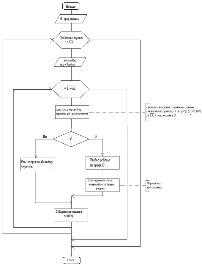 Рассмотрим данный алгоритм на примере. Пусть существует некая группа людей, которая представлена в виде графа. Некоторые люди внутри этой группы знают друг друга («знакомство» двух людей является ребром в этом графе). Присоединение новой вершины к графу сравнимо с попаданием ещё одного человека в этот коллектив. Он присоединяется к случайной паре знакомых людей (выбирается вершина со степенью связности равной 2). Таким образом, образуется новый треугольник (человек влился в коллектив). Далее алгоритм повторяется с уже другим человеком (вершиной).