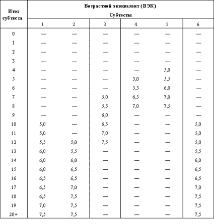 Затем необходимо произвести преобразование итогов субтеста в оценки по шкале, для чего используют таблицу «Шкала преобразований итогов субтеста в оценки по шкале». Например, хронологический возраст исследуемого ребенка — 5,5 лет. Он выполнил тест с результатом по субтестам: 1—9 баллов, 2—15 баллов, 3—13 баллов,.... Оценки по шкале данного ребенка будут: 1—7, 2—9, 3—10,.... Суммируя оценки по шкале всех субтестов, получаем коэффициент восприятия (КВ), максимальное значение которого равно 60, и вносим его в «Таблицу итогов тестирования для специалистов».