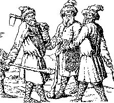 Изготовить дубинку совсем просто. Молодое деревце вырывалось из земли, комель очищался от корней, ствол обрубался по нужной длине, по усмотрению хозяина кору либо счищали, либо оставляли как есть. На иллюстрации изображены русские крестьяне в традиционных костюмах и с традиционным снаряжением. (См. рис.4)5. Смею усомниться в способности дубинки (ослопа) выполнять благородную функцию орудия труда. Хотя, как орудие "лихого" промысла либо как средство борьбы с многочисленными "лихоимцами", дубинка может быть расценена как наиболее удобное, легко добываемое, дешевое и