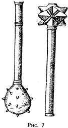 Очевидно, благодаря этим особенностям палочного боя, большинство русских ополченцев предпочитало ударные типы вооружения. Согласитесь, оттачивать технику на поле боя — не самое лучшее время. Хотя и князья проявляли почтение к ударному оружию. Символ княжей власти — шестопер (пернач) обладает теми же свойствами, что и обычная дубина, только многократно усиливается поражающий потенциал за счет металлических частей и их пространственной ориентации, выполненных, кстати, в виде розетки Перуна (См. рис. 8).