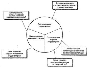 Менеджеры терпеть не могут сюрпризов, особенно если они выливаются в непредсказуемо высокие затраты. Поэтому лучше предусмотреть заранее, какие изменения возможны в системе, с какими компонентами системы будет больше всего проблем при сопровождении, а также рассчитать общие затраты на сопровождение в течение определенного периода времени. На рис. 7 представлены различные типы прогнозов, связанные с сопровождением, и показано, на какие вопросы они должны ответить.