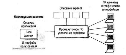 Промежуточное ПО управления экранами (окнами), показанное на рис. 12, осуществляет связь с приложением и действует точно так же, как терминал пользователя. Это программное обеспечение использует описание каждого экрана для интерпретации и вывода данных на экран. В таком виде данные пересылаются на машину клиента, где они представляются с помощью графического интерфейса. В настоящее время процесс описания структуры интерфейса можно реализовать с помощью языка XML. В этом случае не обязательно изменять наследуемую систему. Нужно только создать промежуточное ПО управления экранами и программу поддержки интерфейса на машине клиента.