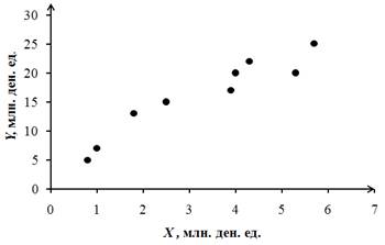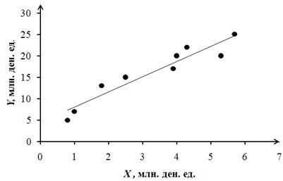 Анализ рисунка позволяет сделать предположение о наличии сильной линейной зависимости прибыли предприятия Y от расходов на рекламу X. При этом связь имеет положительную тенденцию, т.е. с увеличением расходов на рекламу увеличивается прибыль предприятия.