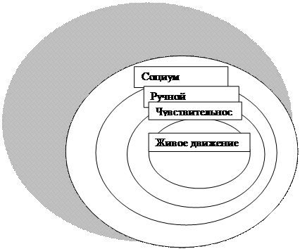 На нашем рисунке (рис. 2) представлена логика актуального существования человека. Здесь самым широким (имеющим наибольший «удельный вес») является понятие «социальное», из которого вытекают все другие понятия. Социальное — «больше» интеллектуального, интеллектуальное — «больше» чувствующего, чувствительность — «больше» обладающего движением. Такое «больше» обозначает законообразующие возможности того или иного уровня развития.