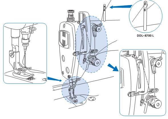 При изучении схемы заправки оборудования необходимо познакомиться со следующими деталями: нитенаправители, регулятор натяжения верхней нити, компенсационная пружина. Знакомство со шпульным колпачком и шпулькой должно сопровождаться указанием рекомендациями по подбору шпулек для конкретного шпульного (шпулечного колпачка) и конкретной машины. Самостоятельная замена шпульного колпачка недопустима, а замена шпульки может привести к обрывности нижней нити или затрудненному съему или слету шпульки с механизма намотки.