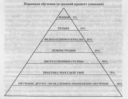 Интерактивные методики позволяют задействовать не только сознание человека, но и его чувства, эмоции, волевые качества, т.е. включают в процесс обучения "целостного человека". Это позволяет увеличить процент усвоения материала. Результаты исследования, проведенного в 80-х годах Национальным тренин-говым центром (штат Мэриленд, США), представлены на схеме, получившей название "пирамида обучения".
