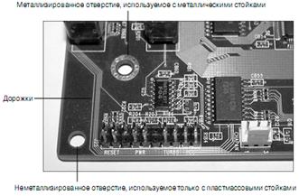 Рис. 22.10. Угловой фрагмент типичной системной платы. Будьте осторожны, чтобы при установке платы не повредить дорожки печатной схемы