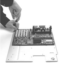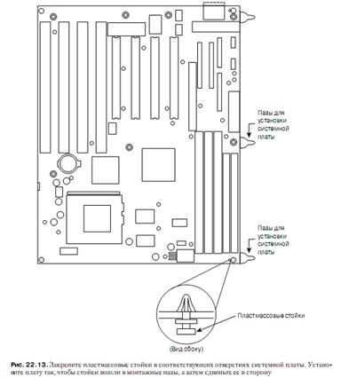 Рис. 22.13. Закрепите пластмассовые стойки в соответствующих отверстиях системной платы. Установите плату так, чтобы стойки вошли в монтажные пазы, а затем сдвиньте ее в сторону