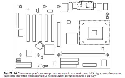 Рис. 22.14. Монтажные резьбовые отверстия в типичной системной плате АТХ. Кружками обозначены резьбовые отверстия, предназначенные для крепления системной платы к корпусу