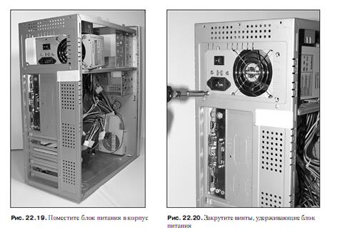 Установить блок питания довольно просто: нужно лишь поместить его в соответствующий отсек корпуса (рис. 22.19) и привинтить несколькими винтами (рис. 22.20).