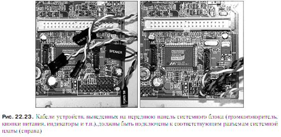 Рис. 22.23. Кабели устройств, выведенных на переднюю панель системного блока (громкоговоритель, кнопки питания, индикаторы и т.п.), должны быть подключены к соответствующим разъемам системной платы (справа)