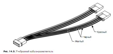 6. Подключите к накопителю кабель питания; чаще всего он четырехжильный со стандартным разъемом. При необходимости приобретите Y-образный кабель-разветвитель (рис. 14.5), чтобы получить возможность подключить два устройства к одному разъему блока питания.