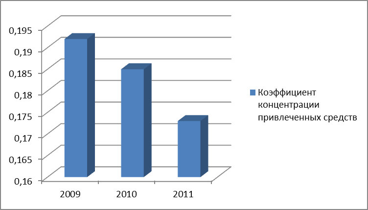 Рисунок 5 — Коэффициент концентрации привлеченных средств ОАО «Брянконфи» за 2009-2011 г.г.