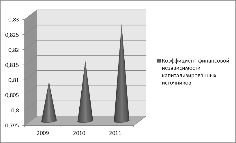 Рисунок 6 — коэффициент финансовой независимости капитализированных источников ОАО «Брянконфи» за 2009-2011 г.г.