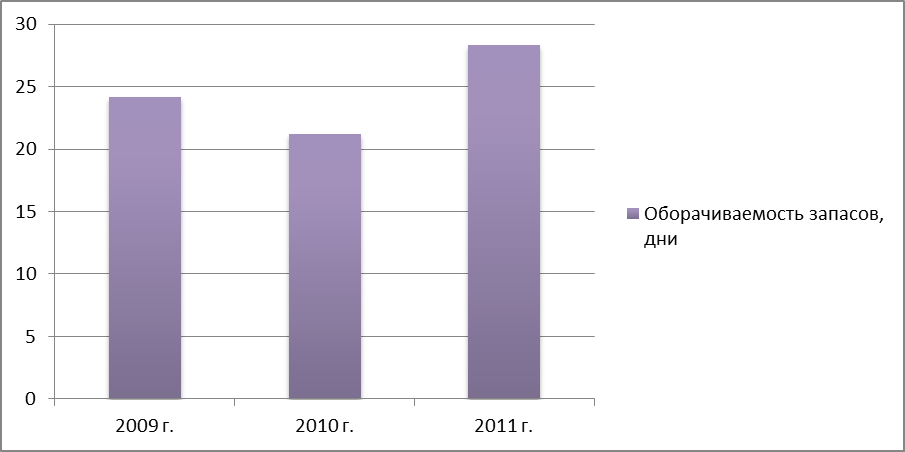 Оборачиваемость запасов показывает, сколько раз за анализируемый период организация использовала средний имеющийся остаток запасов. За анализируемый период данный показатель имеет тенденцию снижения. В 2010 году данный показатель снизился на 1,67 п.п. или на 2,99 дня. В 2011 году оборачиваемость запасов сократилась на 0,55 п.п., а данный показатель в днях увеличился на 7,16. Наглядно оборачиваемость запасов в днях на ОАО «Брянконфи» за 2009-2011 г.г. представлена на рисунке 12.