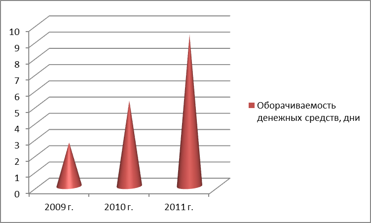 Рисунок 8 – Оборачиваемость запасов в днях ОАО «Брянконфи» за 2009-2011 г.г. Из рисунка видно, что на протяжении 2009-2010 г.г. произошло небольшое снижение оборачиваемости запасов, а в 2011 году намечена тенденция роста запасов, что положительно влияет на деятельность предприятия. Коэффициент оборачиваемости оборотного капитала показывает, сколько прибыли приходится на вложенные денежные средства в процессе производства и обращения. Данный показатель на протяжении 2009-2011 г.г. имеет тенденцию снижения. Показатель оборачиваемости в днях на протяжении периода растет. В 2010 году показатель вырос на 21,28 дней, а в 2011 году – на 8,08 дней. Это негативно сказывается на финансовом состоянии предприятия. Оборачиваемость дебиторской задолженности показывает насколько эффективно компания организовала работу по сбору оплаты за свою продукцию. Данный показатель также имеет тенденцию снижения. Снижение данного показателя может сигнализировать не только о росте числа неплатежеспособных клиентов, но и может быть связан с переходом компании к более мягкой политике взаимоотношений с клиентами, направленной на расширение доли рынка. Оборачиваемость денежных средств также имеет тенденцию снижения. Оборачиваемость денежных средств в днях растет, что негативно сказывается на положении предприятия. Динамика оборачиваемости денежных средств в днях показана на рисунке 15.