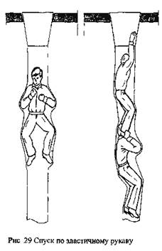 3) оттягивают нижний конец рукава в сторону для уменьшения скорости спуска спасаемого или в случае, когда расстояние от нижней кромки рукава до земли слишком мало, чтобы обеспечить свободный выход спасаемого из рукава;