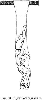 для спуска в рукаве подростка или человека, который не в состоянии самостоятельно осуществить спуск из-за появления у него страха высоты необходимо посадить его на плечи одному из членов расчета или помощнику из числа спасающихся и произвести совместный спуск. Сопровождающий должен регулировать скорость спуска разведением локтей и коленей, при этом страховщики должны обеспечить безопасную скорость спуска спасаемых с помощью указанных выше приемов (Рис. 30).