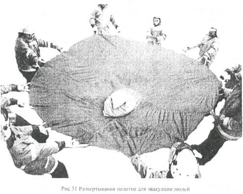 после того как полотно расстелено, подает команду составу расчета: "К полотну (указывается место установки полотна) на спасание людей - сбор!";