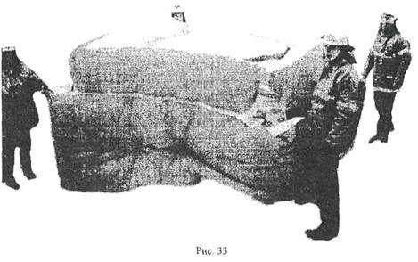 Пожарный № 1 открывает вентиль воздушного баллона, при этом выходящий воздух начнет заполнять воздушный каркас, а "куб" - раскладываться и принимать форму. Пожарный № 2 при необходимости расправляет "куб". Когда каркас заполнится и примет форму, перепускной клапан в верхней части каркаса начнет "травить" воздух, извещая о том, что "куб" полностью развернут и готов к использованию. После этого пожарный № 1 закрывает вентиль воздушного баллона, перекрывая тем самым подачу воздуха (перепускной клапан может продолжать "травить" по мере нагрева воздуха в воздушном каркасе до температуры окружающей среды). После закрытия баллона расчет поднимает каркас "куба", перемещает его к месту проведения спасательных работ (Рис. 33).