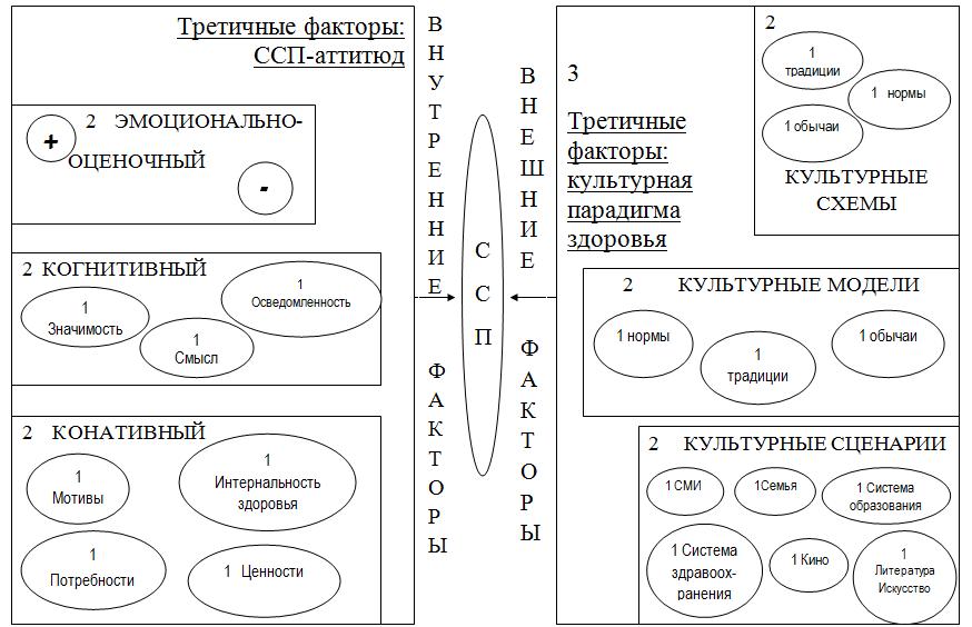 Факторы второго порядка включены в свою очередь в состав факторов третьего порядка (третичные артефакты): картины здоровья в сознании личности, мировоззрения, культурной парадигмы здоровья. Способы самосохранительного поведения, приобретенные во взаимодействии с третичными факторами, могут распространяться за пределы их использования, не требуют постоянного подкрепления и внешнего контроля. (рис. 1)
