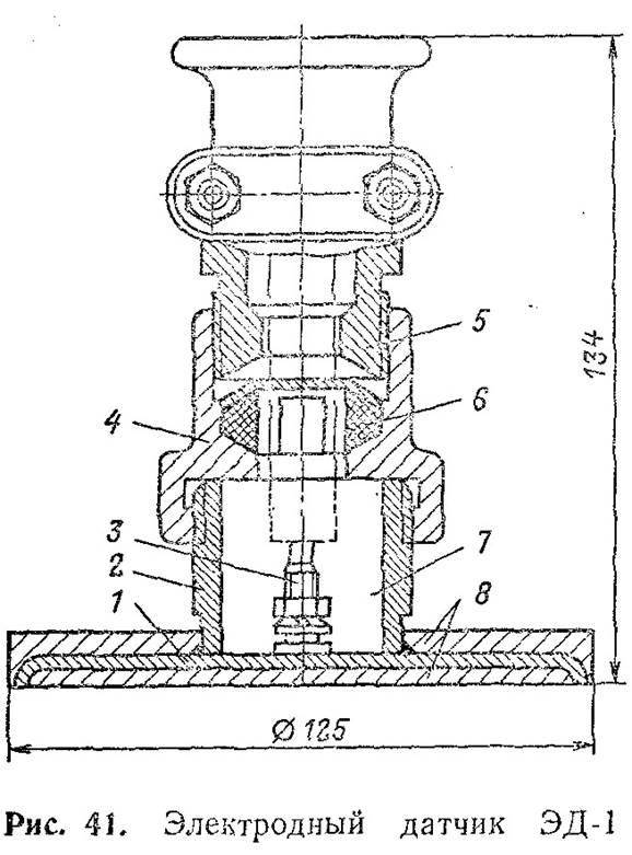 Электродный датчик ЭД-1 (рис. 41) состоит из стального или латунного диска 1, к которому приварен стальной стакан 2. Внутри стакана размещена, приваренная к диску, контактная шпилька 3. На стакан навернут кабельный штуцер 4, внутрь которого ввинчена нажимная гайка 5 кабельного ввода, прижимающая уплотни-тсльную резиновую втулку 6. Полость 7 стакана после присоединения жилы кабеля к шпильке заливают компаундом.