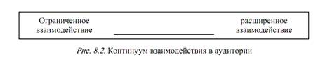 На выбор методов обучения влияет индивидуальный стиль преподавания, что отражается и на уровне взаимодействия в аудитории: между преподавателем и студентом и между студентами. Представим на схеме континуум взаимодействия в аудитории.