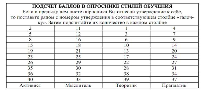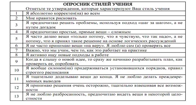 Воспользуемся опросником стиля учения, который предложила Джейн Льюис, сотрудница университета Северного Лондона. В опроснике 40 утверждений, и надо отметить те, которые соответствуют Вашему стилю обучения.