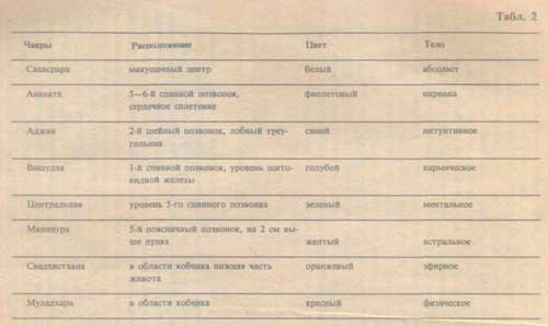 Человек — дитя Космоса. Все наши органы соотносятся с силами, циркулирующими в Космосе. Согласно тантрическому учению тонкие миры создают наше индивидуальное тело, которое, как и Вселенная, состоящая из семи основных миров, имеет семь основных тел. Эти тела состоят из материи и энергии соответствующих миров, взаимодействуют с ними, получают оттуда информацию. Все тонкие тела находятся в тесной взаимосвязи между собой, сообщаясь со своим миром через определенные энергетические центры — чакры, находящиеся на позвоночнике с внутренней стороны. (На рис. 1 приведены основные чакры, их расположение и связи).