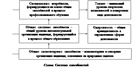Различаются общие и специальные способности. Общие способности необходимы для всех видов деятельности. Они подразделяются на сложные — способность к обучению, наблюдательность, общий уровень интеллектуального развития и т.д., и элементарные — способности к психическому отражению действительности, элементарный уровень развития восприятия, памяти, мышления, воображения, воли и т.д. Без соответствующего уровня развития элементарных и сложных, интеллектуальных способностей человек не может включиться ни в один из видов человеческой деятельности (см. схему «Система способностей»).