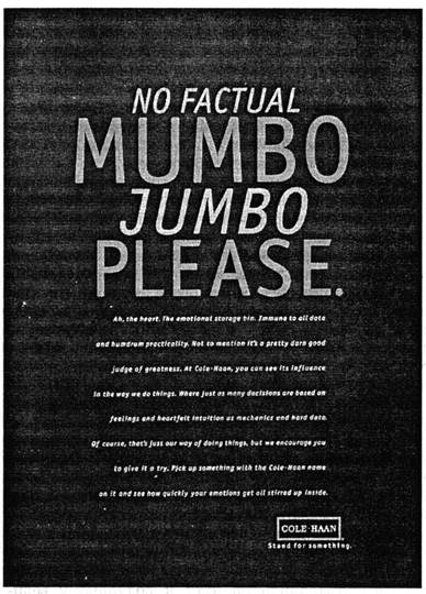 Производитель обуви «Cole-Haan Shoes» развернул печатную кампанию, которой напрочь отвергается подход в стиле маркетинга свойств и преимуществ в пользу обращения к чувствам и эмпирическим ощущениям потребителя. Под броским заголовком «Упаси нас Бог от любых фактов» вниманию клиентов предлагается следующий текст: «Человеческое сердце. Неподкупный индикатор наших эмоций и ощущений. Равнодушный к логике фактов и чуждый практичности. А между тем нет более надежного помощника на пути к подлинному величию. В каждом изделии «Cole-Haan» присутствует частичка нашего сердца и души. В принятии наших решений чувства и интуиция играют ничуть не меньшую роль, чем технические возможности и бесстрастные колонки цифровых данных. Да, так мы работаем и приглашаем вас оценить плоды нашего труда. Стоит приобрести что-нибудь с логотипом нашей марки, и вы почувствуете, как ожили и заиграли ваши эмоции». Рекламный текст завершается стандартным логотипом «Cole-Haan» и призывом: «Прислушайтесь к себе».