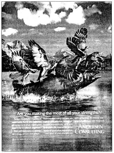 Фирмы, оказывающие консультативные услуги в сфере управления, традиционно сторонятся рекламы. По словам Роберта Дубоффа из «Mercer Management», «если бы десять лет назад я предложил прибегнуть к рекламе наших услуг, меня бы обязательно уволили, пять лет назад - дали бы хорошую взбучку». Крупнейшее в своем бизнесе на мировом уровне консалтинговое агентство «Andersen Consulting», располагавшее на момент написания этой книги штатом в 59 тысяч сотрудников, одним из первых изменило традиции и в 1994 году расширило спектр собственных маркетинговых операций за счет инициирования эмпирической брэндинговой кампании, имевшей целью подчеркнуть индивидуальность агентства и его особое положение на рынке консалтинговых услуг. Разработка кампании была поручена фирме «Young & Rubicam», которая должна была донести до потенциальных клиентов проповедуемую «Andersen Consulting» уникальную концепцию комплексного подхода к консультированию по проблемам управления. Эта концепция рассматривает выработку стратегии, использование информационных технологий, человеческих ресурсов и возможностей технологического процесса не изолированно друг от друга, а как взаимосвязанные элементы, характер которых должен быть согласованно приведен в соответствие с потребностями клиента.