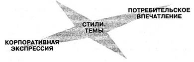 Некоторые из ключевых инструментов планирования и компонентов управления сенсорными переживаниями были уже представлены мною в «Маркетинговой эстетике». Как показано на приведенной ниже схеме, корпоративная экспрессия (общественное лицо организации) воздействует на клиентов и партнеров компании (в частности, на поставщиков, инвесторов, общество в целом) через посредство первичных признаков, проповедуемые стили и разрабатываемые темы, что в итоге формирует определенное потребительское впечатление (индивидуальные представления о компании и идентичности ее брэнда).