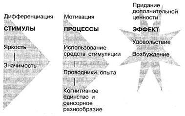 Для дифференциации продуктов через сенсорное воздействие необходимо понимать, каковы стимулы, способные обеспечить его наиболее оптимальным способом. Для мотивации потребителей нужно выяснить принципы самого процесса активизации ощущений. Наконец, для придания нашим усилиям ценностной значимости в глазах потребителя надо сознавать последствия сенсорного воздействия (см. схему).