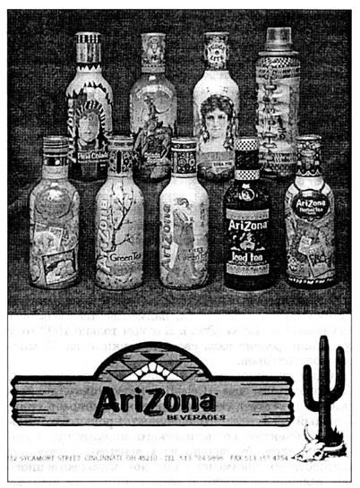 Особым творческим подходом отличаются охлажденные чаи «Arizona», представленные несколькими продуктовыми линиями, каждая в своем отличительном оформлении. Например, напиток «Green Tea» с основой из зеленого чая имеет бутылочку цвета морской волны, расписанную в японском стиле цветами сакуры и скорее вызывающую ассоциации с объектом декоративного искусства, а не с напитком. Женыпеневый экстракт «Arizona» несет на себе символику индейских племен Юго-Запада, включая изображения бизона, сверкающих молний и фигуры воина в ритуальной маске. Коллекция диетических чаев «Arizona» предлагается в бутылках, расписанных роскошными старыми этикетками с тары для фруктов и стилизованными рисунками самих экзотических плодов. Так, на «джутовой» поверхности бутылочек с лимонным «Honey Lemon» скрупулезно воспроизведены лейблы поставщиков цитрусовых начала века. Линия «Lite» включает сливочно-шоколадный напиток, бутылка которого украшена выполненным в стиле прошлого столетия изображением миловидной розовощекой женщины, задрапированной в американский флаг. Здесь же идиллическая сцена романтической эпохи покорения Дикого Запада. Ностальгический ретро-стиль характерен и для серии «Cowboy Cocktails», включающей коктейль «Colada», на бутылке которого ковбой пытается удержаться на спине необъезженного мустанга.