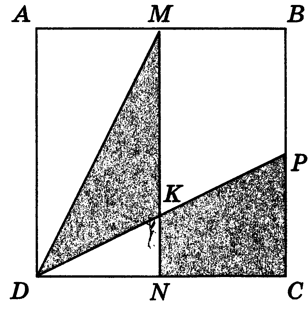 Задача 2. Дан квадрат ABCD (рис. 3). Вершина квадрата D соединена с точками М и Р, которые соответственно являются серединами сторон АВ и ВС. Точка М соединена с точкой N, являющейся серединой стороны DC. Докажите, что