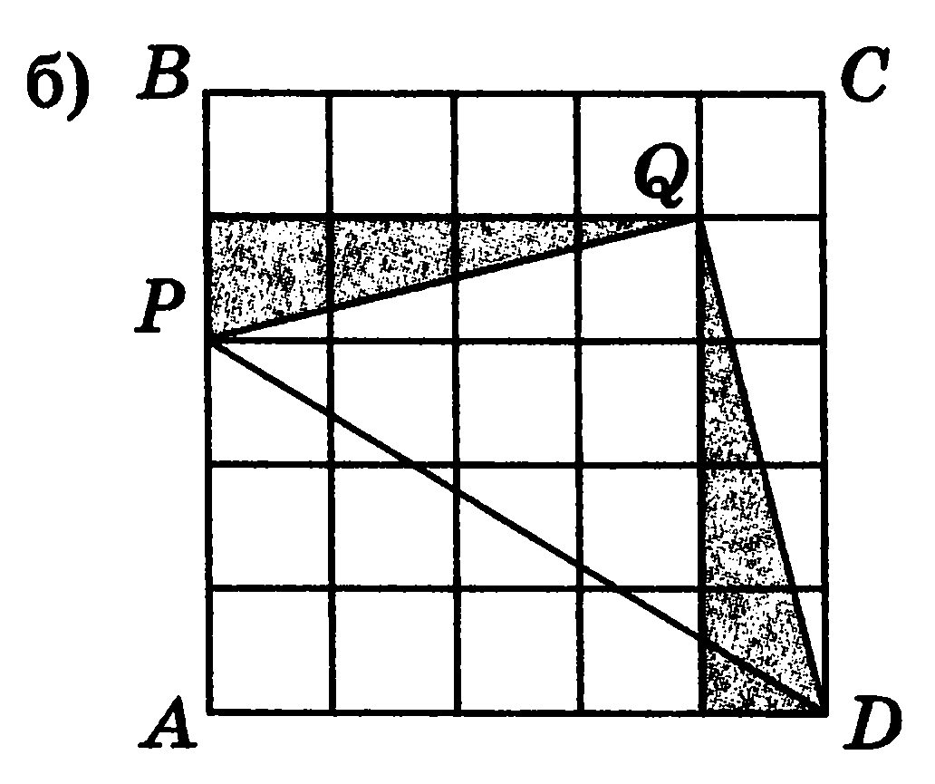 Разделим квадрат ABCD на 25 маленьких квадратиков. В силу условия задачи точки Р и Q окажутся вершинами не которых из этих квадратиков (рис. 11, б). Так как прямоугольные треугольники, заштрихованные на рисунке, равны и один из них получается из другого поворотом вокруг точки Q на 90°, то мы имеем PQ = QD, ∠PQD = 90°. Видим, что ∆PQD является равнобедренным прямоугольным треугольником с гипотенузой PD, следовательно, ∠PQD = 90°, ∠QPD = ∠PDQ = 45°.