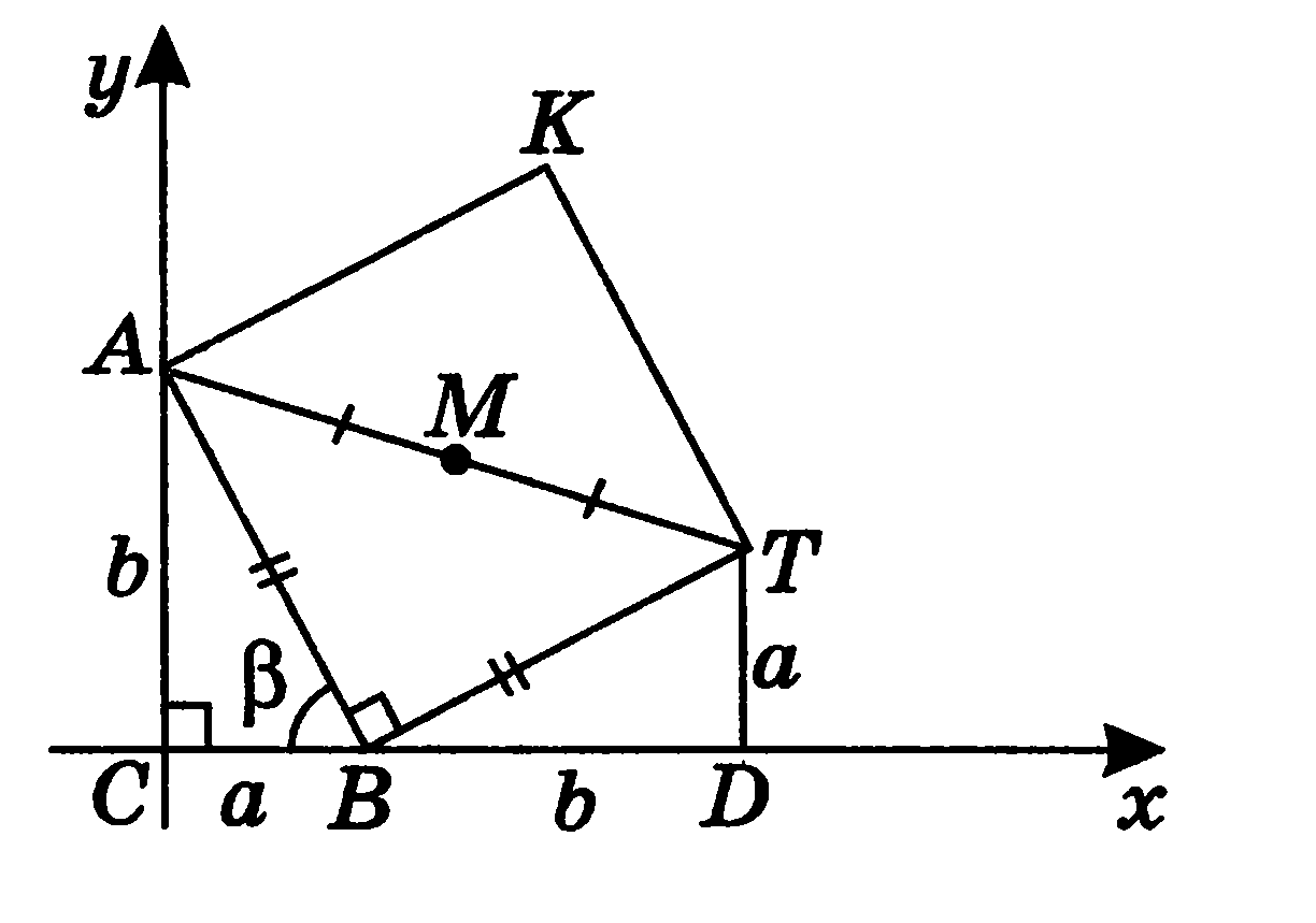= ∆BAC). Тогда BD = АС = b, TD = BC = a. Значит, координаты точки Т будут Т(а + b; а). М — середина отрезка АТ, поэтому