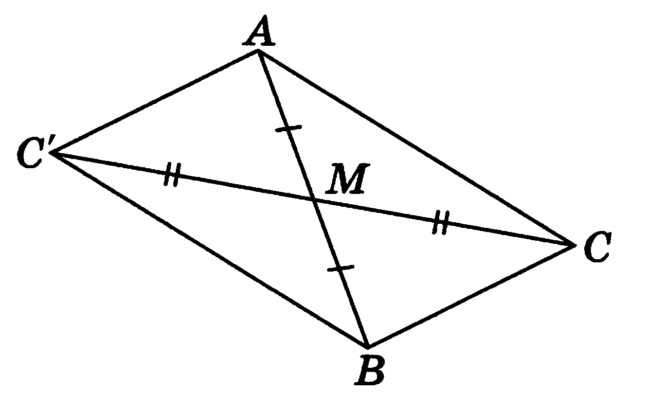 Пусть СМ — медиана треугольника ABC (рис. 16). Продолжим МС на отрезок МС' = СМ. Тогда четырехугольник АСВС'— параллелограмм, и, следовательно, ВС'=АС, СС' = 2