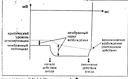 Рисунок к задачам 2,3. Изменения мембранного потенциала и критического уровня деполяризации при действии анода.