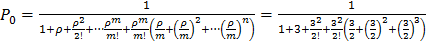m = 2, n = 3, λ = 1,5, µ = 1/T = 1/2, значит ρ = λ/µ = 3.