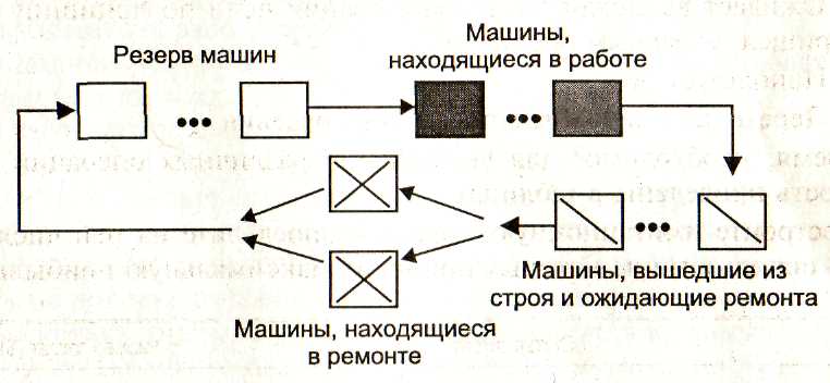 На трикотажной фабрике 50 швейных машин работают по 8 часов в день 5 дней в неделю. Любая из этих машин может в любой момент времени выйти из строя. В этом случае её заменяют резервной машиной либо сразу (если есть резерв), либо по мере его появления. Тем временем сломанную машину отправляют в ремонтную мастерскую, где ее чинят и возвращают в цех, но уже в качестве резервной. В существующем замкнутом цикле движения машин можно выделить 4 фазы (см. рисунок).